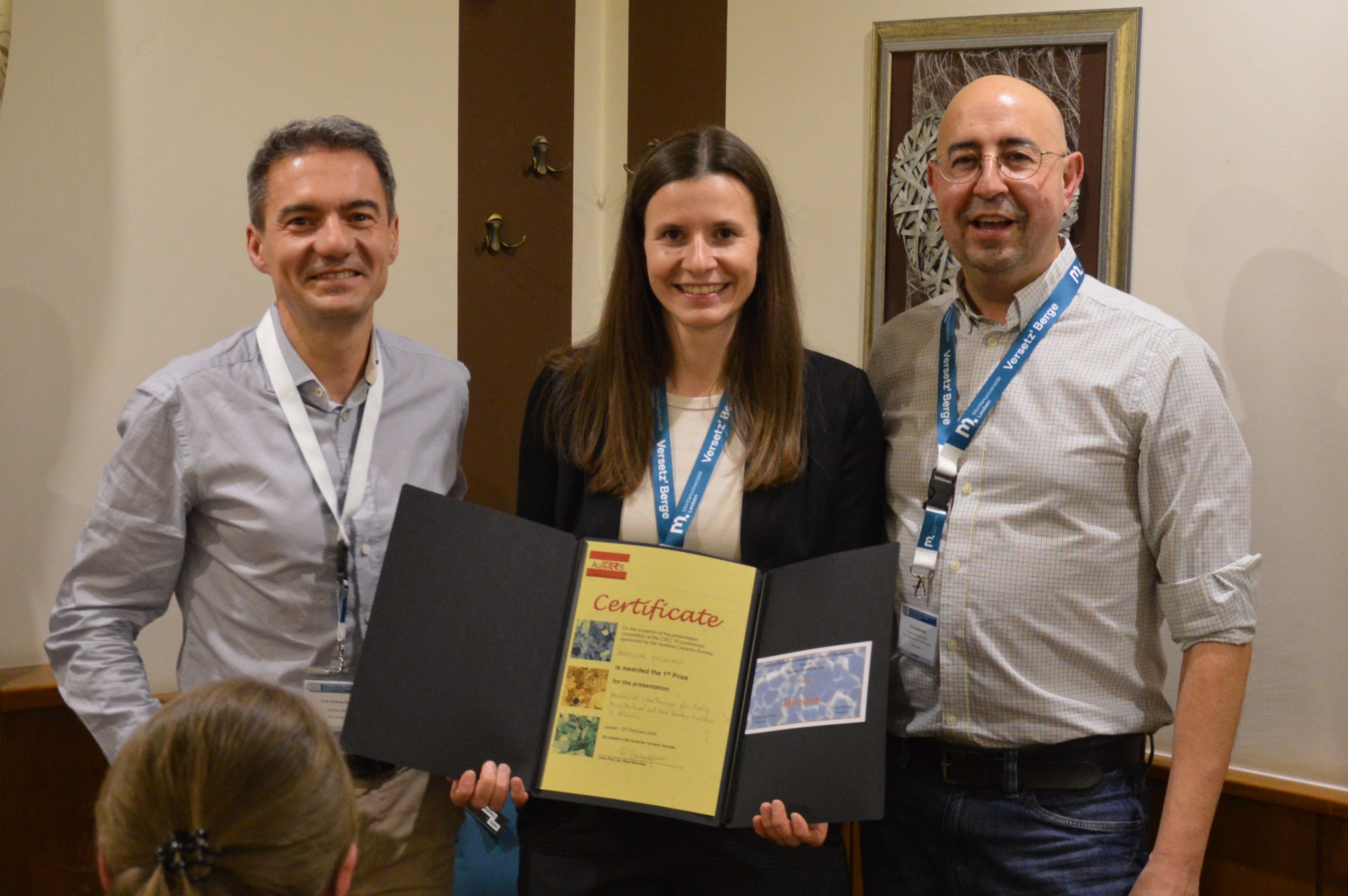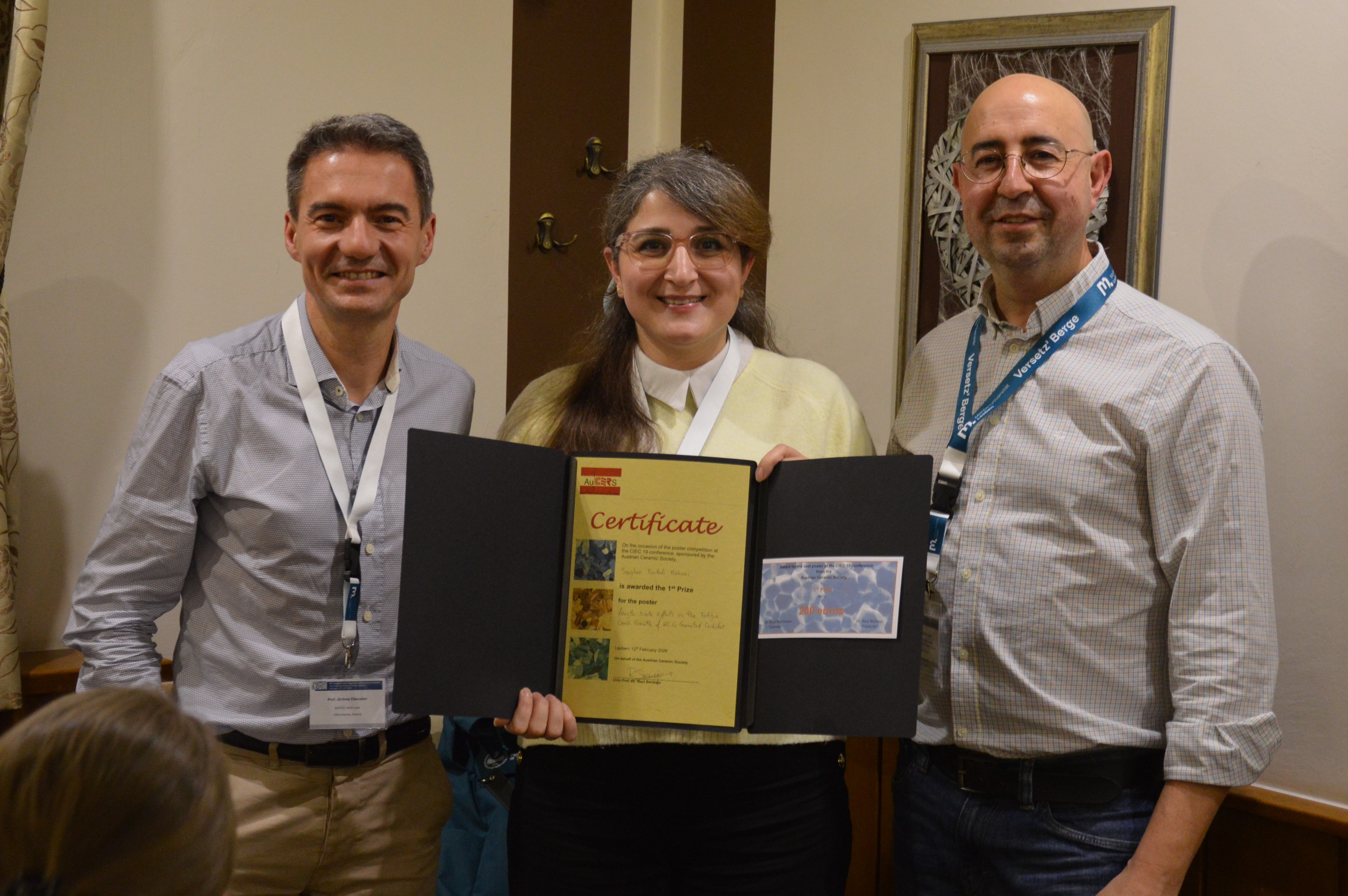 Der Best-Poster-Award (1. Preis) ging an Frau Saghar Fooladi Mahani von der Universitat Politècnica de Catalunya in Barcelona, Spanien, die mit ihrem Poster „Length scale effects on the fatigue crack growth of WC-Co cemented carbides“ die meisten Stimmen der Konferenzteilnehmer für sich gewinnen konnte. Gewählt wurde das beste Poster mittels Abstimmung unter allen Teilnehmern.