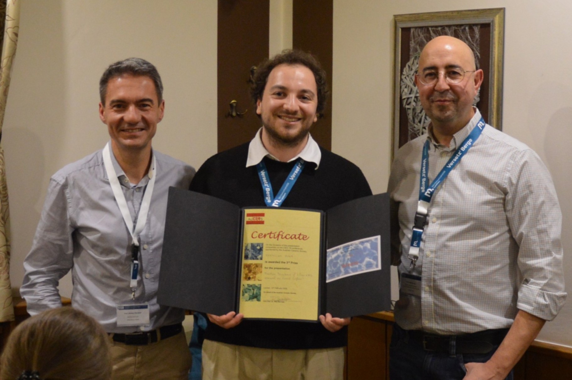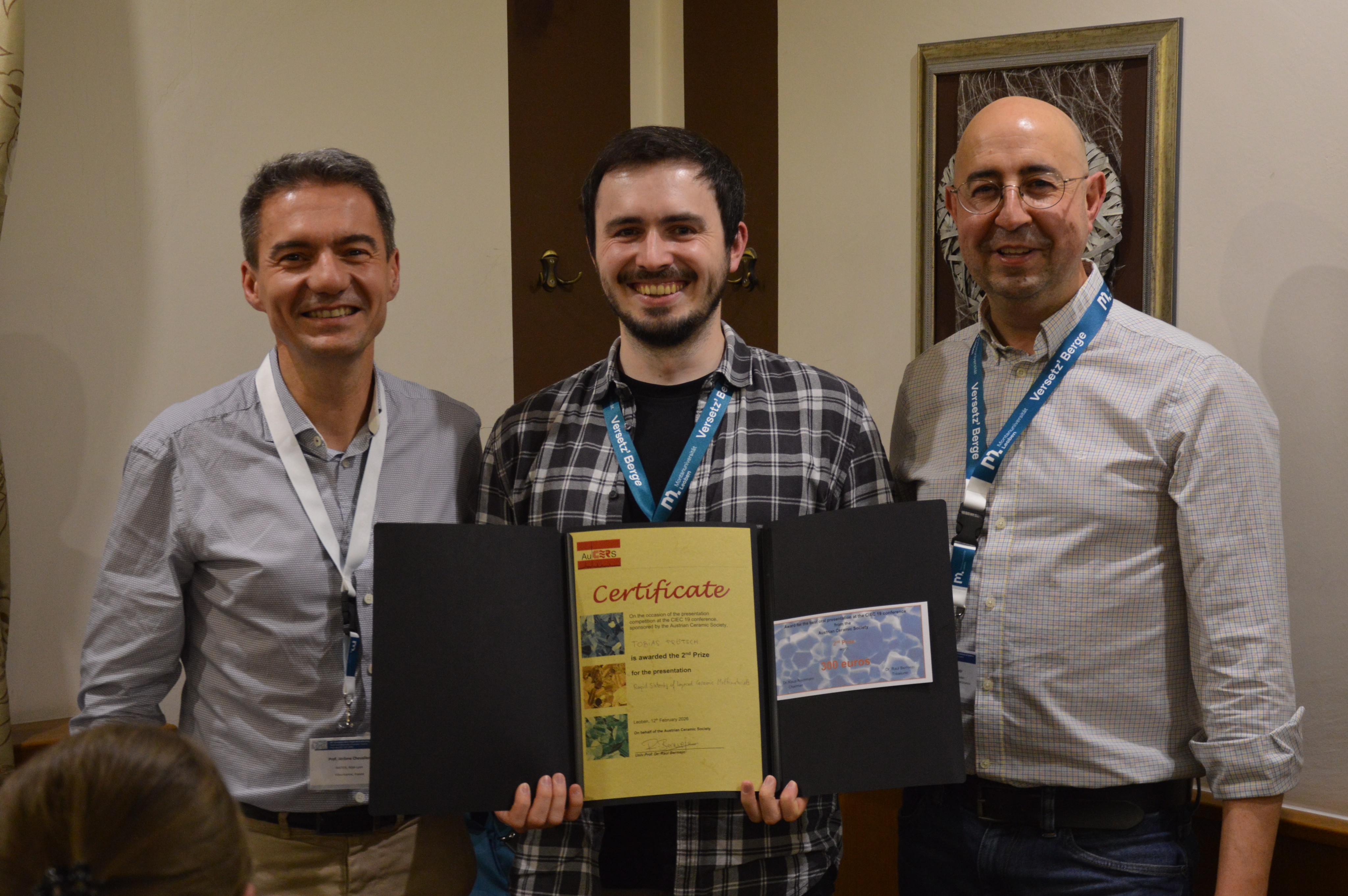 Die Preise aus dem Best-Presentation-Contest wurden mithilfe einer internationalen Fachjury ermittelt, wobei von den Juroren nicht für die eigene Forschungsgruppe gestimmt werden durfte. Den verdienten 1. Preis erlangte Frau Annalena Erlacher von der Nanopowders and Ceramics Group an der EMPA Dübendorf, Schweiz, für ihren Vortrag „Mechanical spectroscopy for probing microstructural and grain boundary evolution in alumina“. Der 2. Platz ging an Herrn Tobias Prötsch vom Lehrstuhl für Struktur- und Funktionskeramik der Montanuniversität Leoben, der die Fachjury mit seinem Vortrag „Rapid sintering of layered ceramic multi-materials“ begeistern konnte. Herr Maximilian Munz, ebenfalls vom Lehrstuhl für Struktur- und Funktionskeramik der Montanuniversität Leoben, wurde für seinen Vortrag „Fracture toughness of silicon nitride measured on curved surfaces“ mit dem 3. Preis ausgezeichnet.